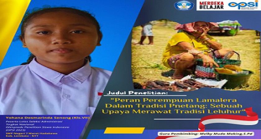 Oh iya, teman-teman….tentu akan ada diantara kalian yang bertanya, kok bisa yah, aku membuat penelitian dan lebih dari itu, proposal penelitianku sudah dinyatakan lolos? Jawabannya mudah, teman-teman. Pertama sekali, aku dibimbing oleh seorang Guru Pembimbing yang sangat luar biasa. Namanya, pak Melky Muda Making,S.Pd. Ia seorang guru Bahasa Inggris di sekolahku. Tapi ia juga seorang peneliti dan penulis hebat. Banyak karya penelitian ilmiah serta artikel-artikel ilmiah hingga buku-buku ber-ISSBN/ISSN yang sudah jadi karya nyata pembimbingku ini yah, teman-teman. Lebih dari itu, ternyata kami punya chemistry yang sama. Pak Melky juga ternyata seorang guru yang suka sekali meneliti dan menulis tentang fenomena sosial dan kemanusiaan, khususnya di Pulau Lembata. Oleh karena itu, aku benar-benar sangat terinspirasi dan termotivasi karena beliau. Yang kedua, kegiatanku mengikuti ajang lomba OPSI ini didukung penuh oleh Kepala Sekolahku, Bapak Frans B.K.Kaona,S.Fil. Sosok ayah di dalam rumah kami i(SMPN 7 Maret Hadakewa) yang selalu hadir mendukung dan memastikan segala sesuatu harus dilaksanakan secara baik dan bertanggungjawab. Yang ketiga, ibu dan bapak guru yang hebat di sekolahku. Selain pak Melky guru pembimbingku, aku juga didorong oleh seluruh guru dan pegawai di sekolahku yah, teman-teman. Mereka selalu memotivasi dan memberi semangat. Yang keempat, adalah sahabat-sahabat terbaikku di sekolah khususnya di kelas VII. Senyum dan canda tawa mereka adalah kekuatanku. Aku yakin, penelitianku ini akan kuselesaikan tepat pada waktunya karena dukungan mereka juga. Dan yang pamungkasnya, adalah kedua orang tuaku di rumah. Puji Tuhan, karena dukungan mereka, aku tetap kuat, sehat dan bertahan hingga sekarang. Aku berjanji, keberhasilanku dalam membuat karya penelitian ini tidak luput dari doa dan dukungan mereka.