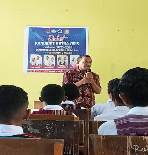 Kamis 20 Juli 2023, SMP Negeri Tujuh Maret Hadakewa, kegiatan debat kandidat untuk pemilihan Ketua OSIS dimulai dengan semarak. Acara ini dihadiri oleh siswa/siswi, bapak/ibu guru dan semua tenaga kependidikan. Para siswa berkumpul dengan penuh semangat di aula sekolah pada pukul 09.00 pagi untuk menyaksikan momen bersejarah ini.